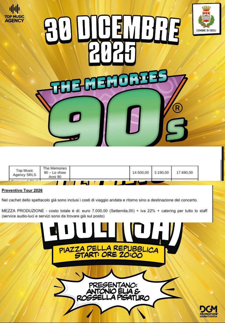 In queate ore viene diramata sui social la copia di due strisce estratte da preventivi che riportano la differenza di importi di ben 10.000 in più per l'evento anni '90 in calendario ad Eboli per il 30 dicembre rispetto ad un non meglio precisato Comune limitrofo : "Il comune di eboli, per lo spettacolo di nostalgia 90 (non quello originale),...