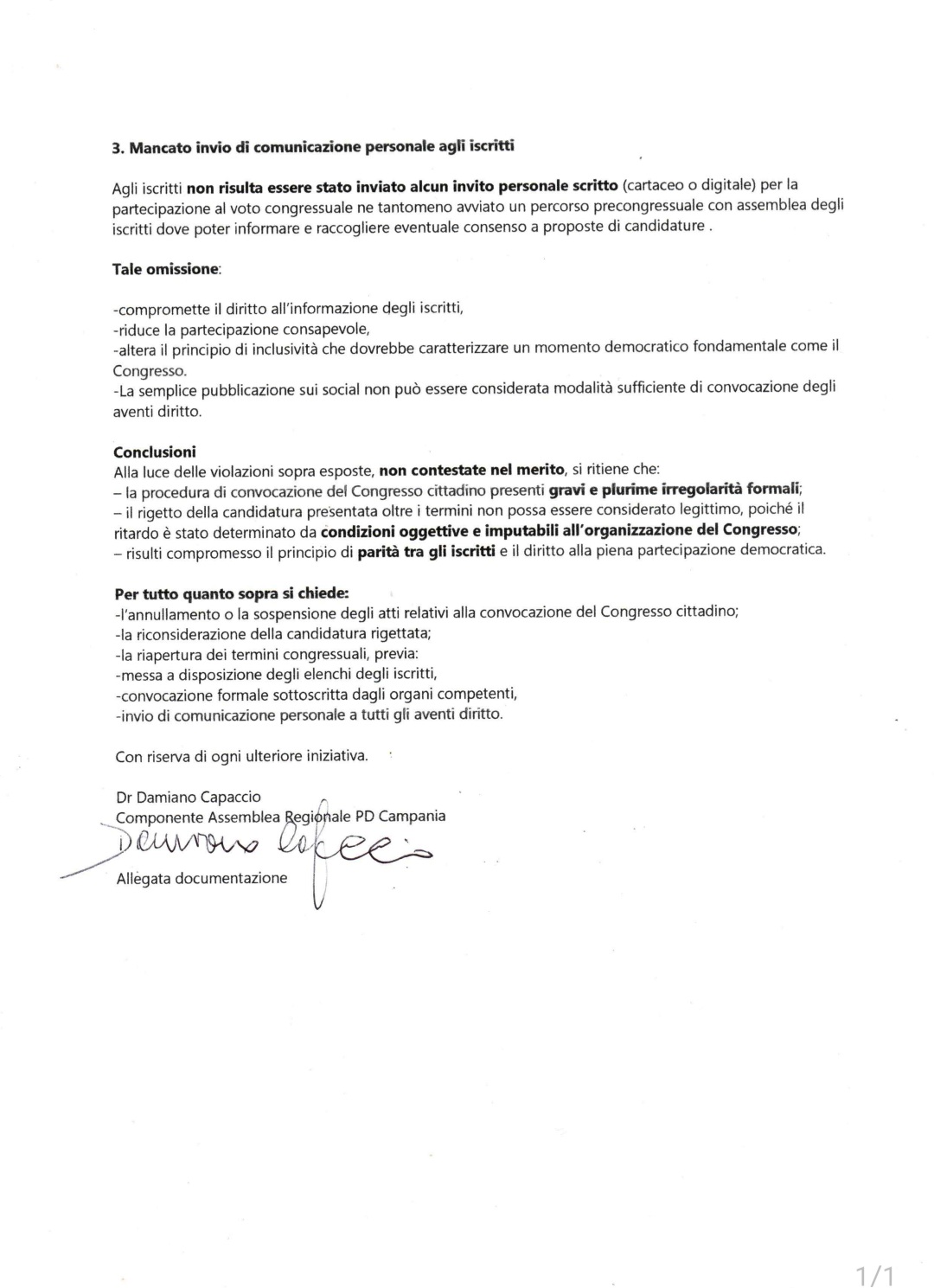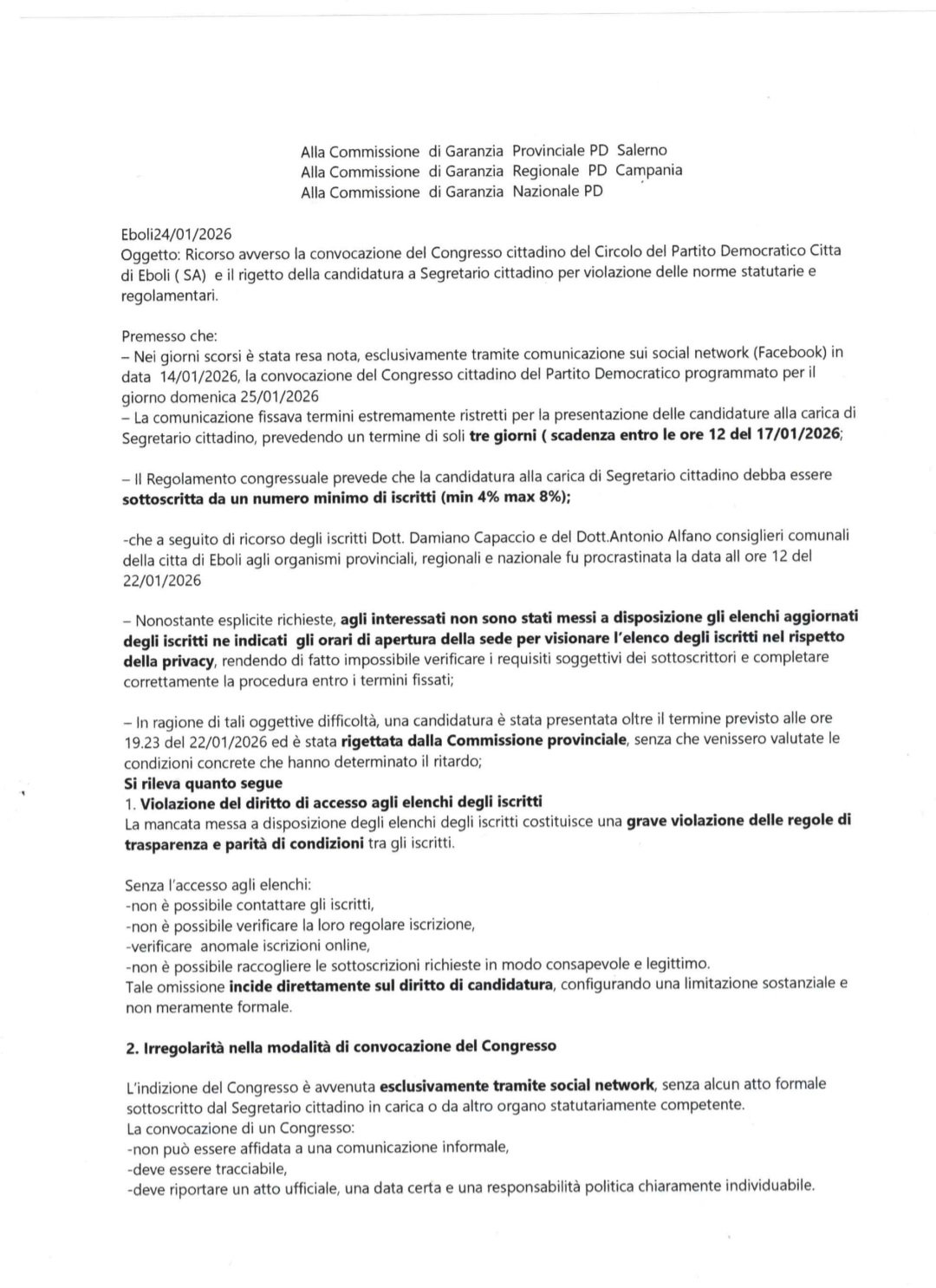 "Alla Commissione di Garanzia Provinciale PD SalernoAlla Commissione di Garanzia Regionale PD CampaniaAlla Commissione di Garanzia Nazionale PDEboli24/01/2026Oggetto: Ricorso awverso la convocazione del Congresso cittadino del Circolo del Partito Democratico Cittadi Eboli (SA) e il rigetto della candidatura a Segretario cittadino per violazione delle norme statutarie eregolamentari.Premesso che:- Nei giorni scorsi è stata resa nota, esclusivamente tramite comunicazione sui social network (Facebook) indata 14/01/2026, la convocazione del Congresso cittadino del Partito Democratico programmato per ilgiorno domenica 25/01/2026La comunicazione fissava termini estremamente ristretti per la presentazione delle candidature alla carica diSegretario cittadino, prevedendo un termine di soli tre giorni ( scadenza entro le ore 12 del 17/01/2026,Il Regolamento congressuale prevede che la candidatura alla carica di Segretario cittadino debba esseresottoscritta da un numero minimo di iscritti (min 4% max 8%);-che a seguito di ricorso degli iscritti Dott. Damiano Capaccio e del Dott./ Antonio Alfano consiglieri comunalidella citta di Eboli agli organismi provinciali, regionali e nazionale fu procrastinata la data all ore 12 del22/01/2026Nonostante esplicite richieste, agli interessati non sono stati messi a disposizione gli elenchi aggiornatidegliliscritti ne indicati gli orari di apertura della sede per visionare l'elenco degli iscritti nel rispettodella privacy, rendendo di fatto impossibile verificare i requisiti soggettivi dei sottoscrittori e completarecorrettamente la procedura entro i termini fissati,-In ragione di tali oggettive difficoltà, una candidatura è stata presentata oltre il termine previsto alle ore19.23 del 22/01/2026 ed è stata rigettata dalla Commissione provinciale, senza che venissero valutate lecondizioni concrete che hanno determinato il ritardo;Si rileva quanto segue1. Violazione del diritto di accesso agli elenchi degli iscrittiLa mancata messa a disposizione degli elenchi degli iscritti costituisce una grave violazione delle regole ditrasparenza E parità di condizioni tra 9li iscritti.Senza l'accesso agli elenchi:-non è possibile contattare gli iscritti,-non è possibile verificare la loro regolare iscrizione,-verificare anomale iscrizioni online,-non è possibile raccogliere le sottoscrizioni richieste in modo consapevole e legittimoTale omissione incide direttamente sul diritto di candidatura, configurando una limitazione sostanziale enon meramente formale2. Irregolarità nella modalità di convocazione del CongressoL'indizione del Congresso è awenuta esclusivamente tramite social network, senza alcun atto formalesottoscritto dal Segretario cittadino in carica o da altro organo statutariamente competenteLa convocazione di un Congresso:-non può essere affidata a una comunicazione informale,-deve essere tracciabile,⁃deve riportare un atto ufficiale, una data certa e una responsabilità politica chiaramente individuabile.3. Mancato invio di comunicazione personale agli iscrittiAgli iscritti non risulta essere stato inviato alcun invito personale scritto (cartaceo o digitale) perlapartecipazione al voto congressuale ne tantomeno awviato un percorso precongressuale con assemblea degliiscritti dove poter informare e raccogliere eventuale consenso a proposte di candidatureTale omissione~compromette il diritto allinformazione degli iscritti,-riduce la partecipazione consapevole,altera il principio di inclusività che dovrebbe caratterizzare un momento democratico fondamentale come ilCongresso.-La semplice pubblicazione sui social non può essere considerata modalità sufficiente di convocazione degliaventi diritto.ConclusioniAlla luce delle violazioni sopra esposte, non contestate nel merito, si ritiene che:- la procedura di convocazione del Congresso cittadino presenti gravi e plurime irregolarità formaliil rigetto della candidatura presentata oltre i termini non possa essere considerato legittimo, poiché ilritardo è stato determinato da condizioni oggettive e imputabiliall'organizzazione del Congresso;risulti compromesso il principio di parità tra gli iscritti e il diritto alla piena partecipazione democraticaPer tutto quanto sopra si chiede:-l'annullamento o la sospensione degli atti relativi alla convocazione del Congresso cittadino-la riconsiderazione della candidatura rigettata;-la riapertura dei termini congressuali, previa:-messa a disposizione degli elenchi degli iscritti,‣convocazione formale sottoscritta dagli organi competenti,-invio di comunicazione personale a tutti gli aventi dirittoCon riserva di ogni ulteriore iniziativa.Dr Damiano CapaccioComponente Assemblea Regionale PD Campania"