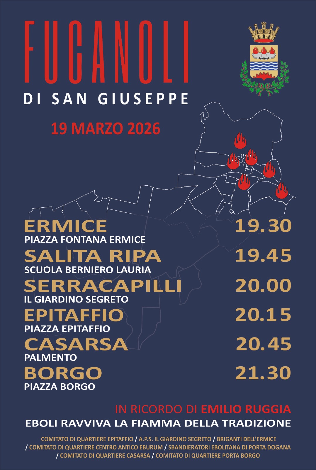 🔥 Fucanoli di San Giuseppe 2026.Eboli celebra la tradizione dei Fucanoli di San Giuseppe – Edizione 2026 dedicata alla memoria di Emilio RuggiaLa Città di Eboli si prepara a rinnovare uno degli appuntamenti più sentiti della propria tradizione popolare: i Fucanoli di San Giuseppe, in programma il 19 marzo 2026 in diversi quartieri della città .L'iniziativa, promossa e sostenuta dall'Amministrazione comunale in collaborazione con i comitati di quartiere e le associazioni cittadine, rappresenta un momento di grande partecipazione comunitaria, capace di unire memoria, identità e spirito di condivisione. I tradizionali falò, simbolo di rinascita e di passaggio dall'inverno alla primavera, torneranno ad accendersi nei quartieri della città , mantenendo viva una tradizione profondamente radicata nella storia e nella cultura locale.L'edizione 2026 dei Fucanoli di San Giuseppe sarà dedicata alla memoria di Emilio Ruggia, storico presidente del Comitato di Quartiere Casarsa, figura molto stimata dalla comunità e protagonista instancabile nella salvaguardia e nella promozione di questa tradizione. Il suo impegno, la sua passione civica e il suo attaccamento al quartiere hanno contribuito negli anni a mantenere vivo lo spirito autentico dei Fucanoli, rendendoli un patrimonio condiviso dell'intera città .Il programma della serata prevede l'accensione dei falò nei diversi quartieri secondo il seguente calendario:Ermice – Piazza Fontana Ermice: ore 19.30Salita Ripa – Scuola Berniero Lauria: ore 19.45Serracapilli – Il Giardino Segreto: ore 20.00