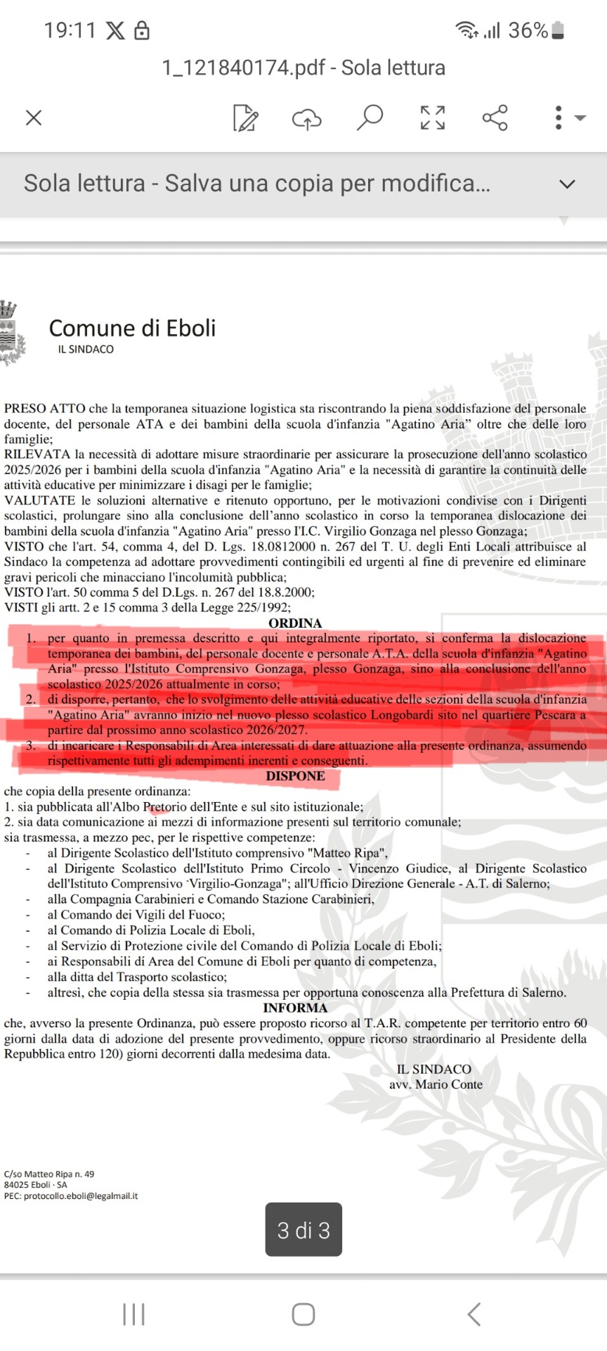 Così come si legge nell'ordinanza del Sindaco di #Eboli del 09/01/2026 riguardante il #Proseguimento delle #attività #didattiche degli #alunni della scuola d'infanzia "#Agatino #Aria' dell'Istituto Comprensivo Matteo Ripa presso l'istituto Comprensivo Gonzaga, gli stessi continueranno ad essere ospitati presso lo stesso plesso (il Gonzaga) sino alla conclusione dell'anno scolastico 2025/2026.