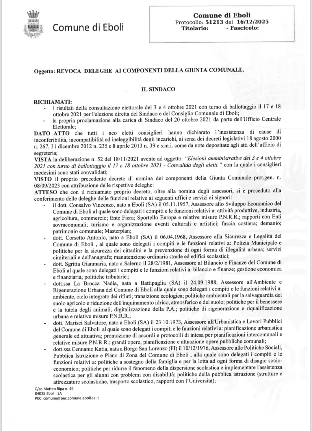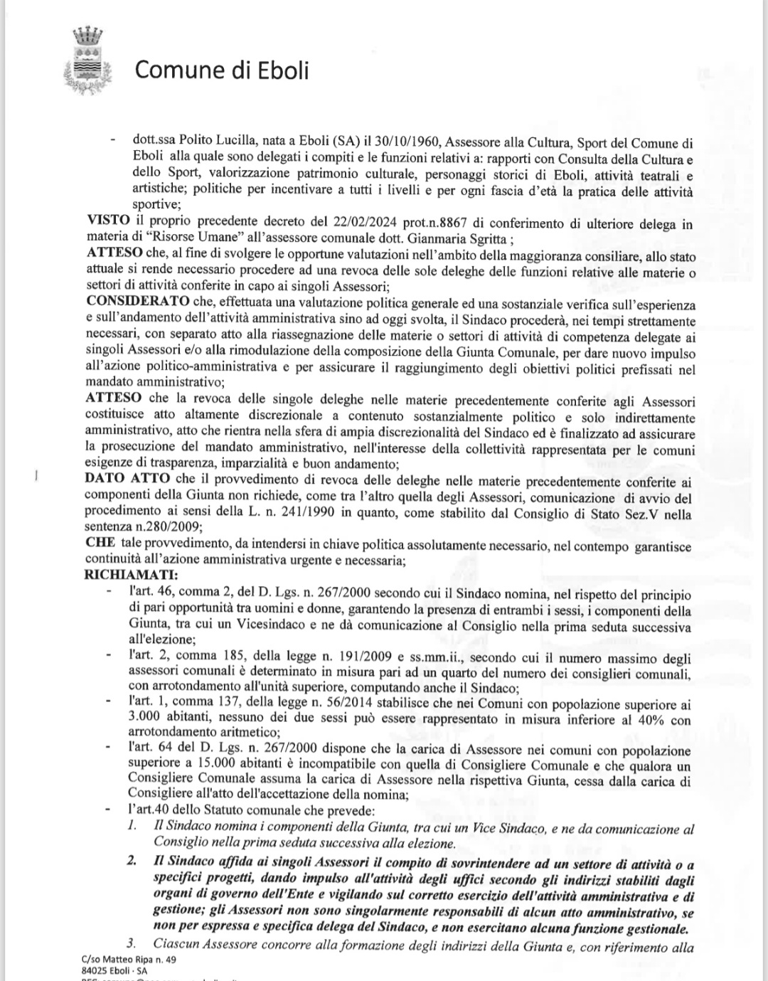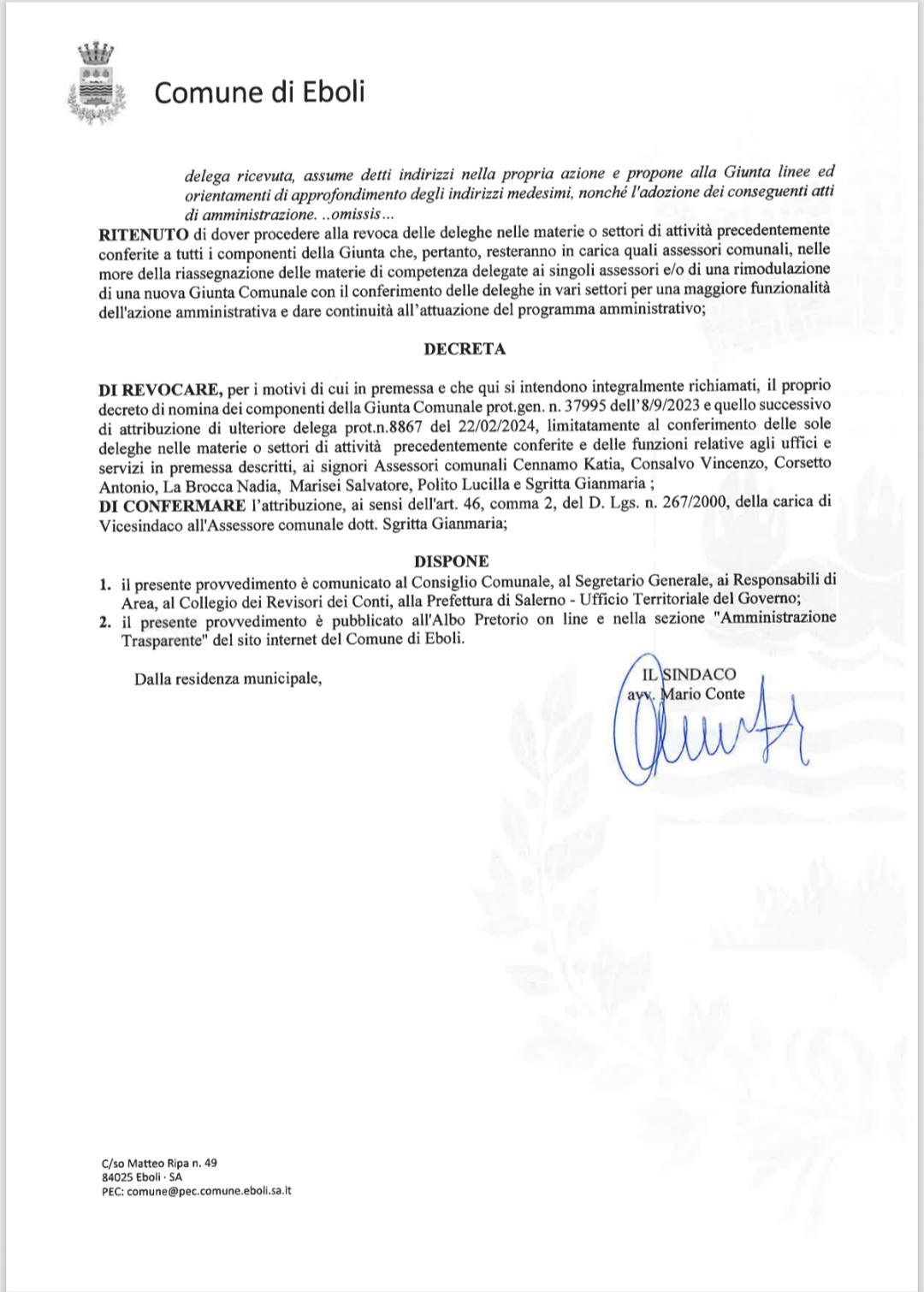 DI #REVOCARE, per i motivi di cui in premessa e che qui si intendono integralmente richiamati, il proprio decreto di nomina dei componenti della Giunta Comunale prot.gen. n. 37995 dell'8/9/2023 e quello successivo di attribuzione di ulteriore delega prot.n.8867 del 22/02/2024, limitatamente al conferimento delle sole deleghe nelle materie o settori di attività precedentemente conferite e delle funzioni relative agli uffici e servizi in premessa descritti, ai signori Assessori comunali Cennamo Katia, Consalvo Vincenzo, Corsetto Antonio, La Brocca Nadia, Marisei Salvatore, Polito Lucilla e Sgritta Gianmaria; DI CONFERMARE l'attribuzione, ai sensi dell'art. 46, comma 2, del D. Lgs. n. 267/2000, della carica di Vicesindaco all'Assessore comunale dott. Sgritta Gianmaria;