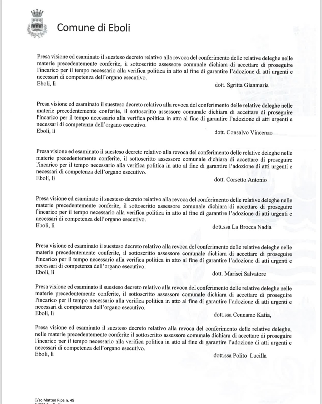 È stata pubblicata la delibera della revoca degli assessori in carica.